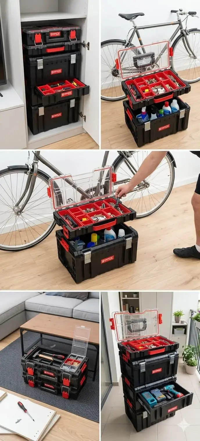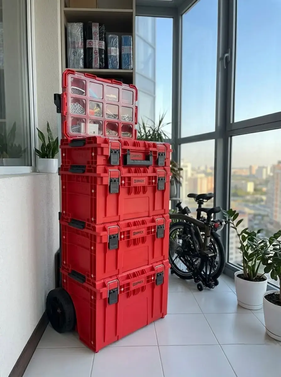 Система, которую можно собрать в компактную вертикальную конструкцию, позволяет сохранить порядок и защитить содержимое. Вместо нескольких разрозненных коробок появляется устойчивый комплект, который легко перенести в квартиру при необходимости. Балкон остаётся аккуратным, а инструмент — защищённым.